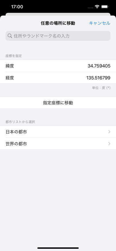 | 住所の表示 | オンにすると住所が表示されます。オフの場合は緯度経度が表示されます。ナビゲーションバーをタップすることでも切り替え可能です。 |