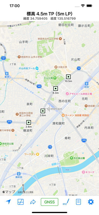 GNSSの特性上,本モードで標高計測できるのは本アプリケーションを使用するiPhone本体のある地点のみ,すなわち利用者の現在地のみです。とくにiPhone本体そのものの地上からの高さ(器械高)が含まれる点が地図計測モードと異なりますのでご注意ください。