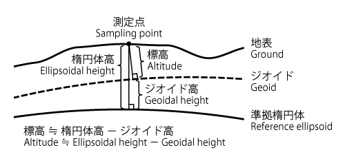 図:標高・楕円体高・ジオイド高の関係