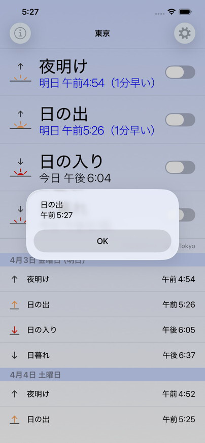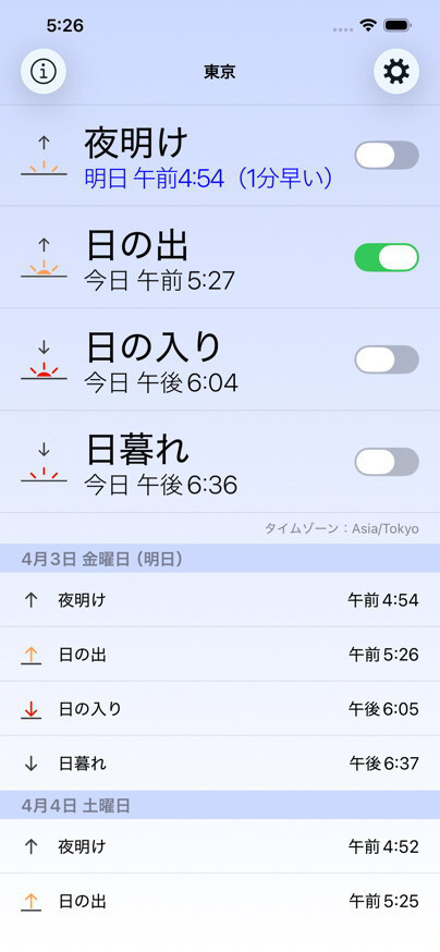 あかつきアラームは日の出・日の入り(日出・日没)および夜明け・日暮れ時刻専用のアラームアプリです。夜明けや日の出とともに活動を開始したい方に最適です。あわせて,現在地および主要な都市の夜明け,日の出,日の入り,日暮れ時刻もすぐに確認することができます。太陽の方向・高度計算はiPhone内部で行っているため,現在地を測定したい場合を除き通信環境は不要です。