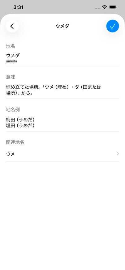 | 地名辞書(水色の本アイコン) | 現住所に災害地名が含まれる場合はアイコンが水色で,タップすると現住所に含まれる災害地名一覧が表示されます。一覧表示中に索引検索を行いたい場合は白抜きのアイコンをタップして下さい。 |