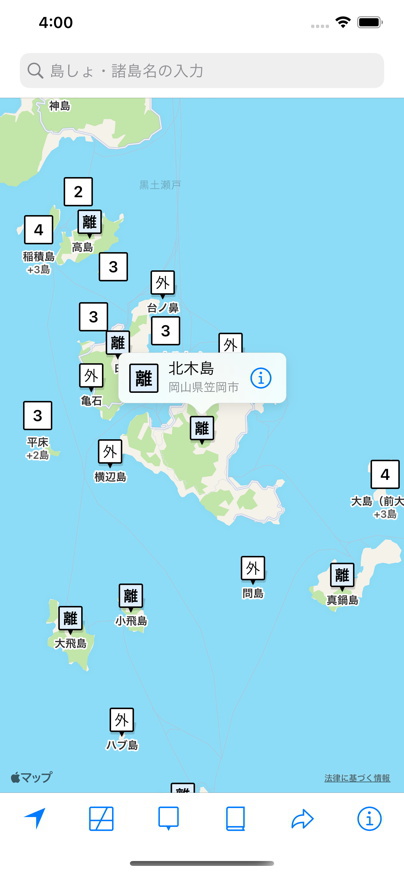 This app contains information on approximately 6,000 islands in Japan. Island attribute information includes the island's name, kana name, English name, location, area, coast length, population, whether it's populated, island grouping name, applicable act, designated area name, basis for territorial sea only, basis for EEZ (Exclusive Economic Zone), populated remote territorial island (RTI) area, specific populated RTI area, name of populated RTI area, included nature park, natural monument, access, and notes. If you are interested in learning about islands in Japan, this app would be very useful.