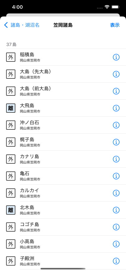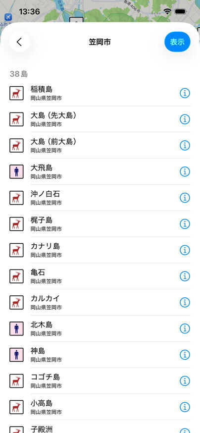 リスト検索後に表示ボタンをタップすると,検索された島しょのみを画面に表示することができます。アイコン表示・非表示ボタンを押すと元に戻ります。 |