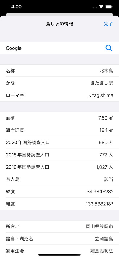 | v1.4.2 2018年10月27日 | iOS 12のサポート 島しょ情報の改訂 平成27年国勢調査人口の追加 |