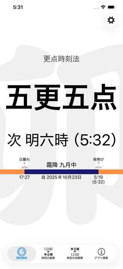 | Koten | Historically, it was used from the Nara era (c. 710–), but this app uses a system that was prevalent during the Edo era (until 1872). During daytime, it operates the same as the Temporeki. However, during nighttime, 1 ko (更) represents one-fifth of the time from dusk to dawn and is divided into 5 ten (点). Each ten is approximately 28 minutes and 48 seconds in the present day. In general, the shin-koku was read as a number of times of a temple bell. And twenty-four-sekki, which is a method that divides one year into twenty-four seasons, had been used because the length of day and night will shift every day. Around midnight (12 a.m.) is referred to as “San-ko san-ten” (三更三点). |