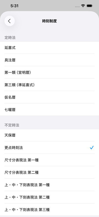 | 具注暦 | 五十刻制。一日十二辰刻,一辰刻が四刻一分(初刻開始),一刻が六分(初刻は五と二分の一分,四刻は一と二分の一分),一分が現在の4分48秒。子二刻一分が現在の午後12時(午前0時)。 奈良時代から明治5年(1872年)の改暦まで使用された具注暦(漢文の暦本)に付随する時刻制度。本アプリは藤原道長の『御堂関白記』で用いられた時刻制度を四捨六入説で解釈して採用している。読みは「ぐちゅうれき」。 |