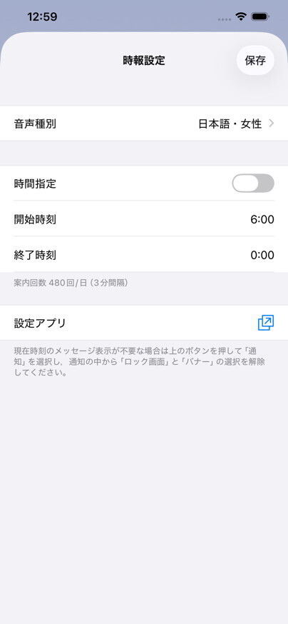 | 時報の表示 | バックグラウンドでの時報案内時に時報のバナーを表示します。音声案内に気付きにくい場合に使用してください。Apple Watchで時報を表示する場合は必ずオンにしてください。iOS14以下で表示されます。 |