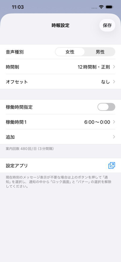 | 通知の表示 | バックグラウンドでの時報案内時に時報のバナー/ダイアログを表示します。音声案内に気付きにくい場合に使用してください。iOS14以下でのみ表示されます。 |