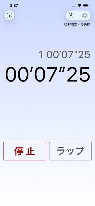 | 計測記録 | メイン画面上部の時計アイコンをタップすると計測記録が表示されます。計測中はラップタイムのみ表示されます。ラップタイム部分をタップしても表示されます。 |