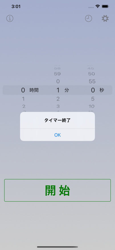 タイマー終了後も継続 | タイマー終了後の経過時間を計測します。フォアグラウンド実行時にタイマー終了時のダイアログは表示されません。 |