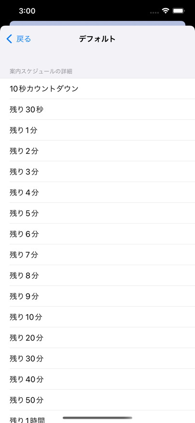 案内スケジュールの編集 | 残り時間案内のタイミングを設定できます。デフォルト設定では使いにくい場合にご使用ください。 |